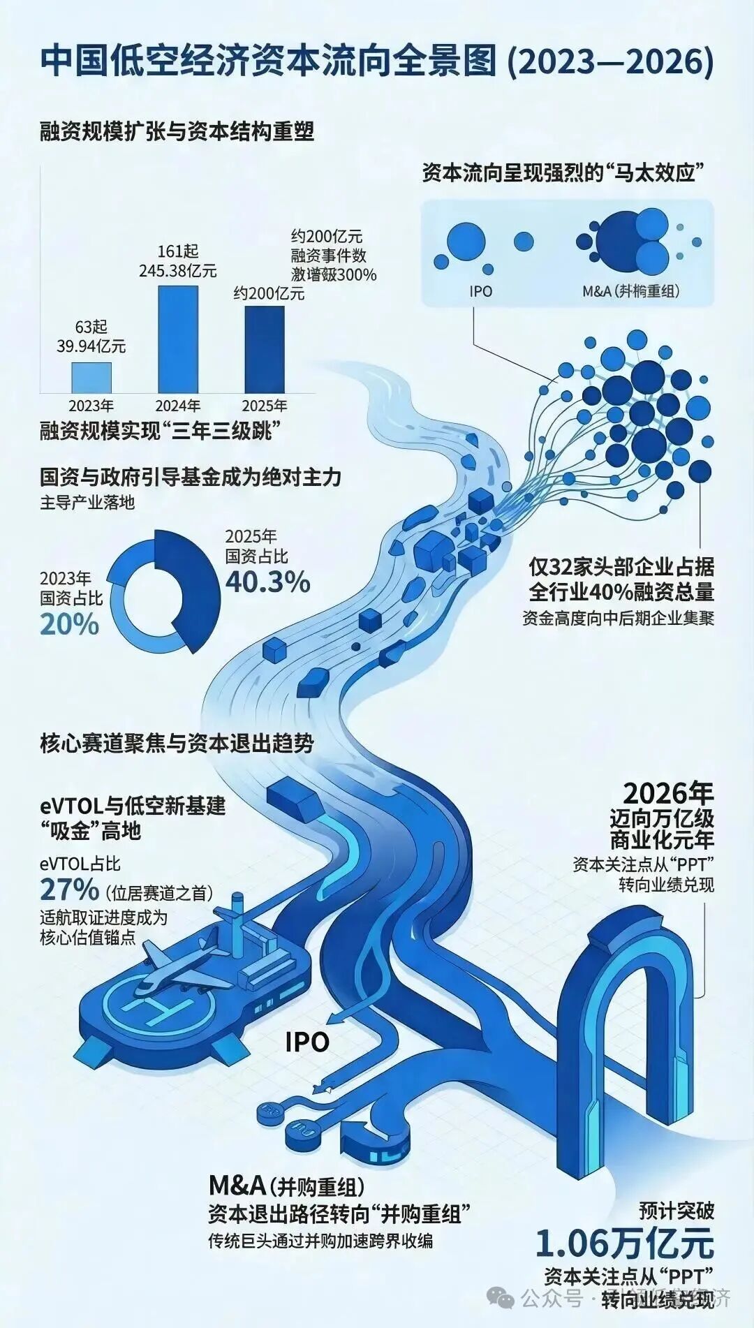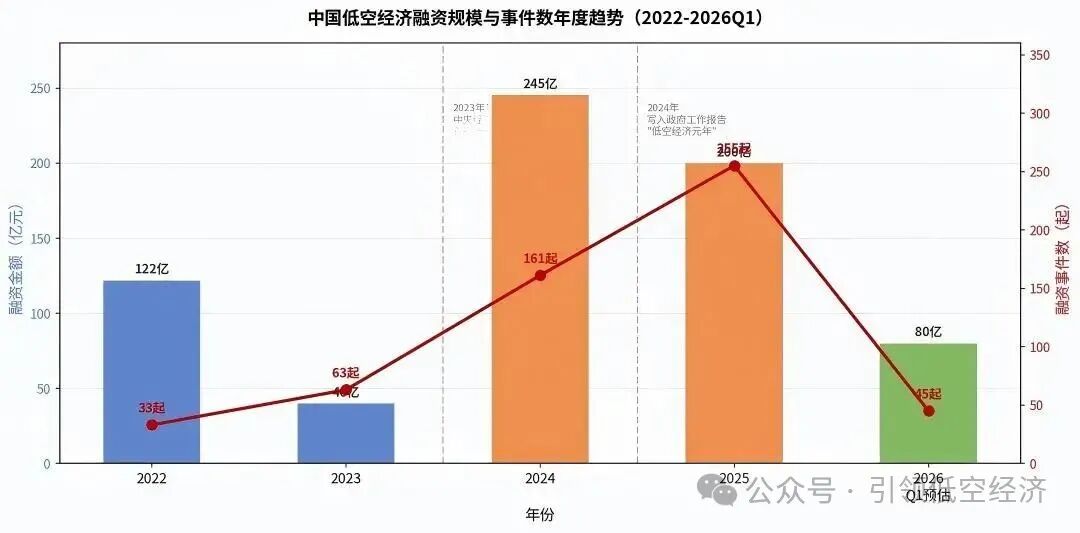 2023年至2026年第一季度,中国低空经济经历了从"政策萌芽"到"资本爆发",再到"理性聚焦"的三段式演进。这一时期,低空经济的资本流向呈现出四大结构性变化:其一,融资规模从2023年的不足40亿元跃升至2025年约200亿元,事件数从63起增至255起,增幅超过300%;其二,国资与地方政府引导基金的占比从20%攀升至40.3%,成为绝对主力;其三,资金高度向具备适航取证能力和量产潜力的头部企业集中,"亿元俱乐部"企业仅32家却占据全年融资总量的40%;其四,并购重组(M&A)已取代单一的IPO,成为一级市场资本退出的核心路径。不少曾靠精美PPT风光无限的初创整机厂,正陆续面临资金紧缺的现实困境,特别是海外的明星eVTOL企业持续遭遇暴击。而国内无论是政策导向还是市场注意力,也正从整机制造转向应用场景、产业链纵深和基础设施建设。中国低空经济的融资规模从2023年的不足40亿元,暴涨至2025年的约200亿元,融资事件激增超过300%。资金总量没有萎缩,萎缩的只是“有资格拿钱的玩家名单”。这是一次由底层金融逻辑突变引发的、极度理性的资本结构大清洗。过去三年,中国低空经济赛道的融资热度经历了显著的量变与质变(如图所示):如图1所示,2022年行业融资虽达121.9亿元,但主要集中于少数大型国有航空项目,民营创新企业的融资事件仅33起。2023年,受政策蓄势期影响,融资金额骤降至39.94亿元,但融资事件数增至63起,说明大量早期项目开始孵化。2024年是真正的"爆发元年":融资事件数跃升至161起,融资金额达245.38亿元,同比增长47.7%,亿元级融资至少11起 。2025年延续高增长态势,全年融资事件高达255起,同比增长71%,创历史新高,但单笔金额向头部集中的趋势愈发明显。